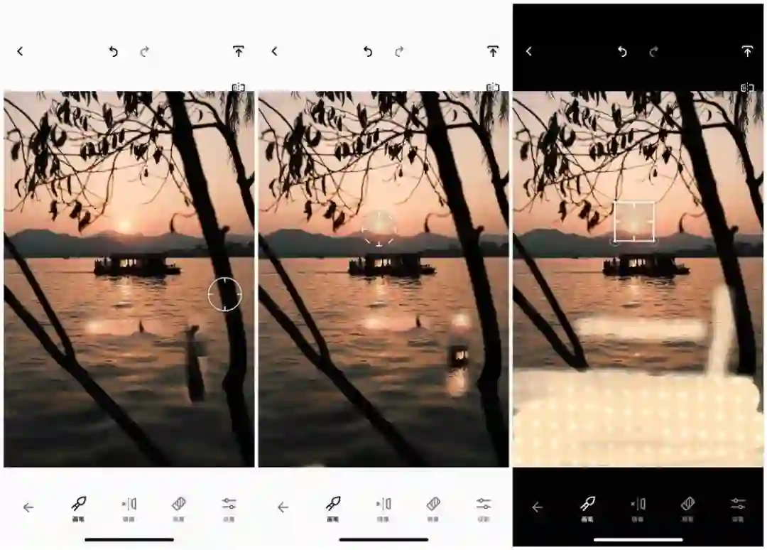 克隆印章你可以类比 Photoshop 中的「仿制图章工具」,原理都是复制源区域的纹理,在画笔路径上批量修复图片。在使用前点击画面,当瞄准框标识在源区域,然后使用画笔在画面上涂抹,涂抹区域就会复制源区域的画面内容。