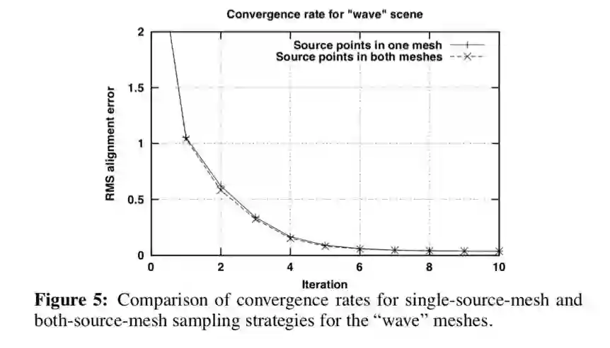 我们将从两个网格上分别取点和从一个网格选点进行对比优势。对于“波浪”测试场景以及基础算法,差距微小(见图5)。然而其中一部分原因是因为使用的是匹配共同最近点算法(见3.2章),两个网格是相对称的。如果使用一个“非对称”算法,如投影或者法相射线(见3.2章)可以看到从两个网格取点有略微优秀一些(见图6),尤其是在开始迭代时两个网格差的较远时。此外,我们认为在网格重叠部分很小或者网格上有漏洞的时候,从两个网格上取点结果会更优。