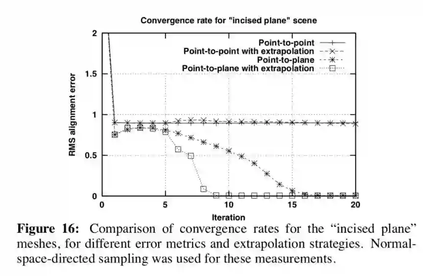 “分形地貌”场景中,我们可以看到即使使用外推法,点到平面的度量误差要远优于点到点的度量(图15)。在“刻痕”场景中,差距就更加明显(图16)。这里点到点的度量就无法得到正确解,因为使用点到点的误差度量无法轻易的使两个平面产生滑动。
