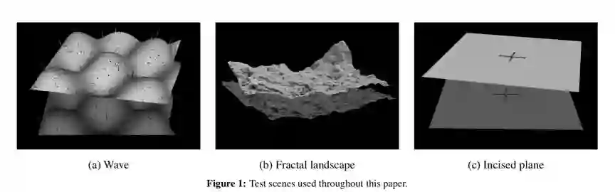我们使用三个人工合成场景来评估变种算法。“波浪”场景Figure1.a)对于大多数ICP算法来说都很简单,因为它包含着相对来说平滑的大比例几何特征。两个网格都相对独立的添加了高斯噪声,异常值以及随机失活。不规则“分形地貌”测试场景(Figure1.b),有着不同程度的细节特征。“划痕平面”(Figure1.c)上则有着高斯白噪及一个“X”形的刻槽。这对ICP来说是一个复杂场景,即使在初始位置上给一个很小的旋转角度,大部分变种都无法获得正确的匹配结果。注意这三个场景都相应包含了低频,全频域及高频特征。尽管这些场景确实不能包括所有的情况,但也是大部分扫描应用中遇到的代表性场景。