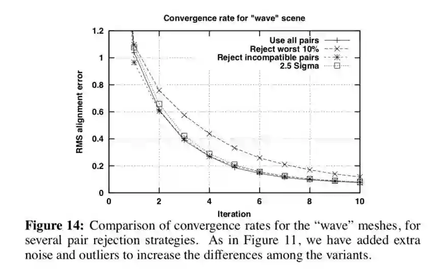 图14显示的是,在“波浪”场景加入额外噪声与异常数据时,对比了无剔除,剔除最差10%,剔除不兼容组队,2.5等方法。我们可以看到对异常值的剔除不会对初始收敛有任何帮助。实际上,即使是最激进的算法(剔除最差的10%)在两个网格距离较远时收敛也很慢。因此结论便是,异常值剔除尽管在最终匹配结果上的精度和稳定性更好,但是对收敛速度并没有帮助。