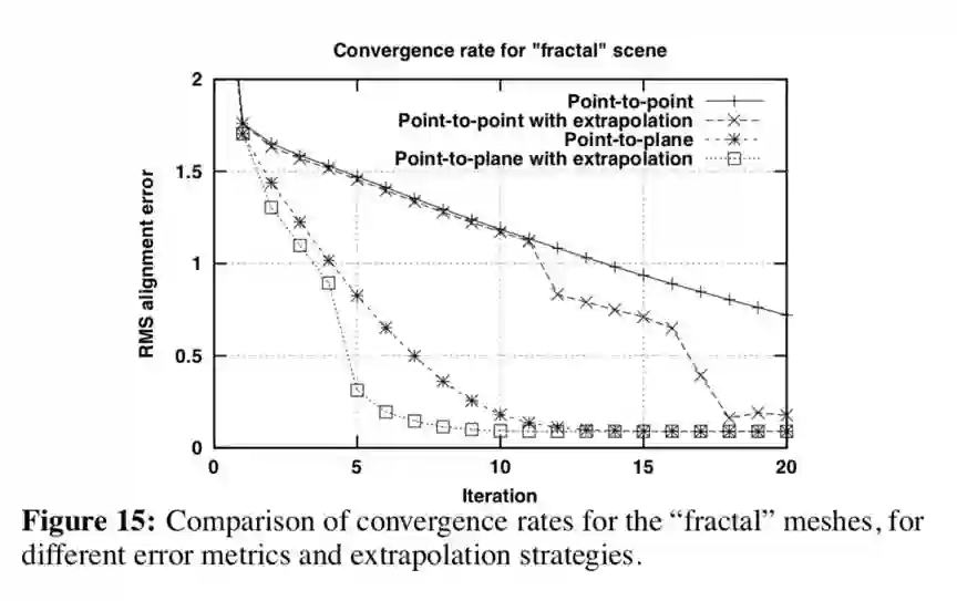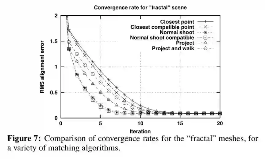 我们归类并对比了几种ICP的变种算法,我们主要关注不同算法间的收敛速度。我们介绍了一种对小且稀疏特征场景可以快速收敛的采样方式。最终,我们展示了一种使用固定时长寻找匹配点的ICP的优化算法,使得两个网格可以在几十毫秒内完成匹配。由于当前我们主要是对收敛速度进行的对比,但是我们预测未来的ICP变种更加注重鲁棒性及准确性。此外,未来会更加关注实际中含噪数据中,不同种类的噪声及干扰对匹配算法影响。