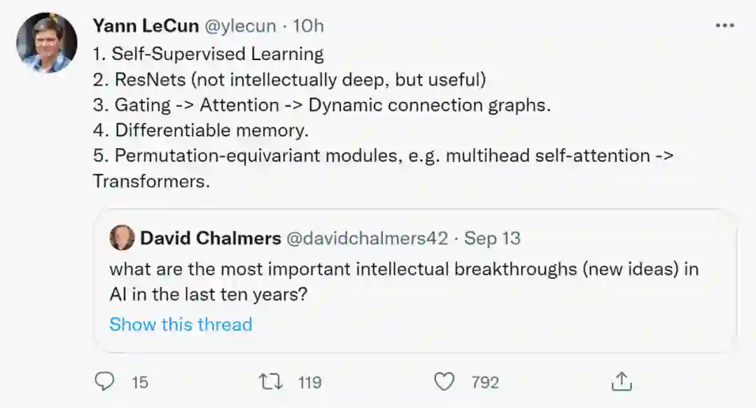 在LeCun看来,过去十年最重要的成果包括自监督学习、ResNets、门-注意力-动态连接图、可微存储和置换等变模块,例如多头自注意力-Transformer。