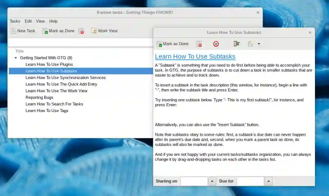 在 GNOME To Do 出现之前,在 GNOME 上追踪任务的首选程序是 Getting things GNOME![4] 这个老式的 GNOME 程序采用多窗口布局,能让你同时显示多个任务的细节。GTG 没有任务列表,它能在任务中添加子任务,甚至在子任务中添加子任务。GTG 同样能添加截止日期和开始日期。也可以通过插件同步其他程序和服务。