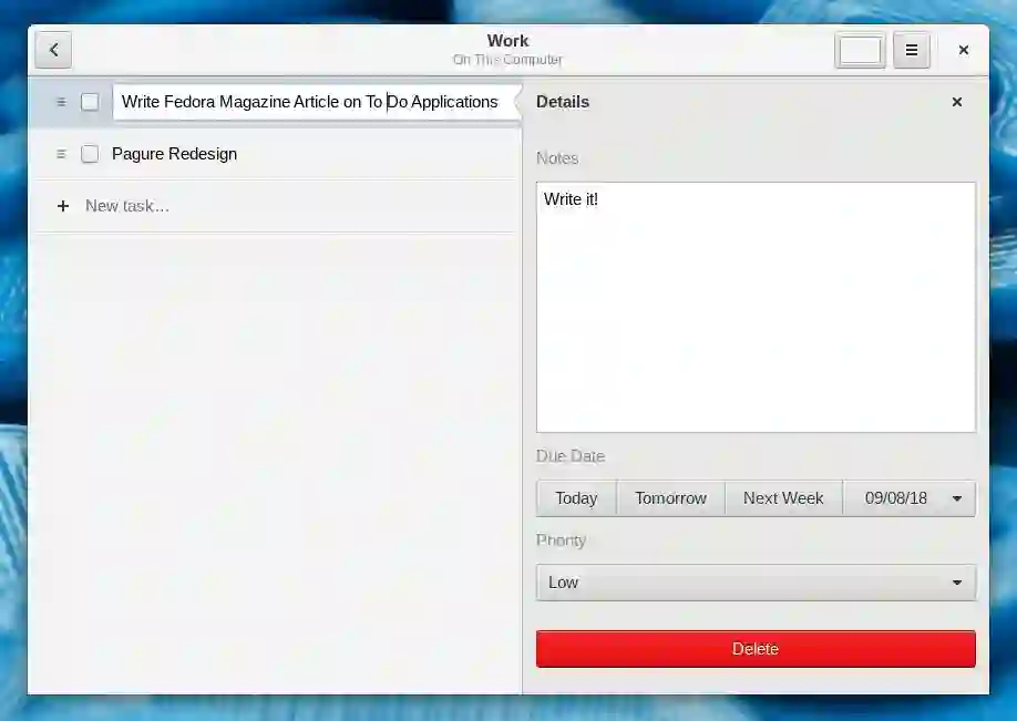 GNOME To Do[1] 是专为 GNOME 桌面(Fedora Workstation 的默认桌面)设计的个人任务管理器。GNOME To Do 与其他程序进行比较,它有一系列简洁的功能。