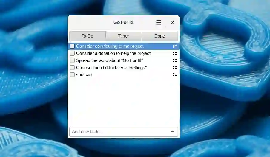 Go For It![5] 是一个超级简单的任务管理程序。它能简单地创建一个任务列表,并在完成后标记它们。它不能将任务分组,也不能创建子任务。Go For It! 默认将任务存储为 todo.txt 格式,这能更方便地同步到在线服务或者其他程序中。额外地,Go For It! 包含了一个简单定时器来追踪你在当前任务花费了多少时间。