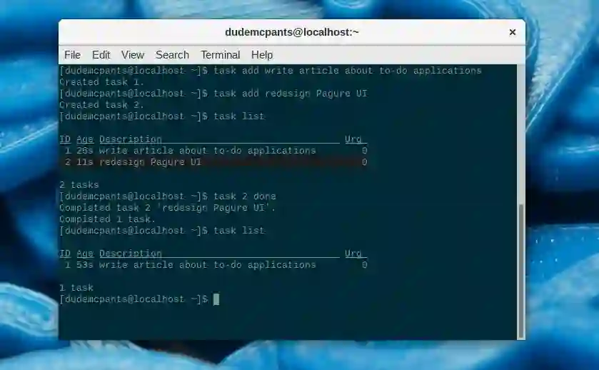 Taskwarrior[8] 是一个灵活的命令行任务管理程序。它高度可定制化,但同样“开箱即用”。使用简单的命令,你可以创建任务,标记完成,并列出当前进行中的任务。另外,任务可以被标记、添加到项目、搜索和过滤。此外,你可以设置循环任务,并设置任务截止日期。
