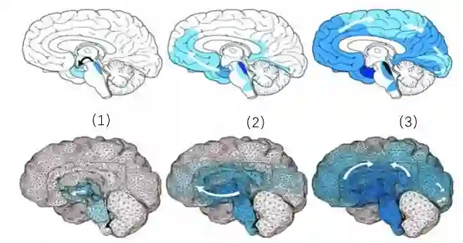 阿尔茨海默症的病理特征是β-淀粉样蛋白组成的老年斑(Plaques),主要位于细胞外;微管蛋白相关蛋白tau组成的神经纤维缠绕(Tangles),主要位于细胞内部;以及受损的神经元(Diseased neuron)。