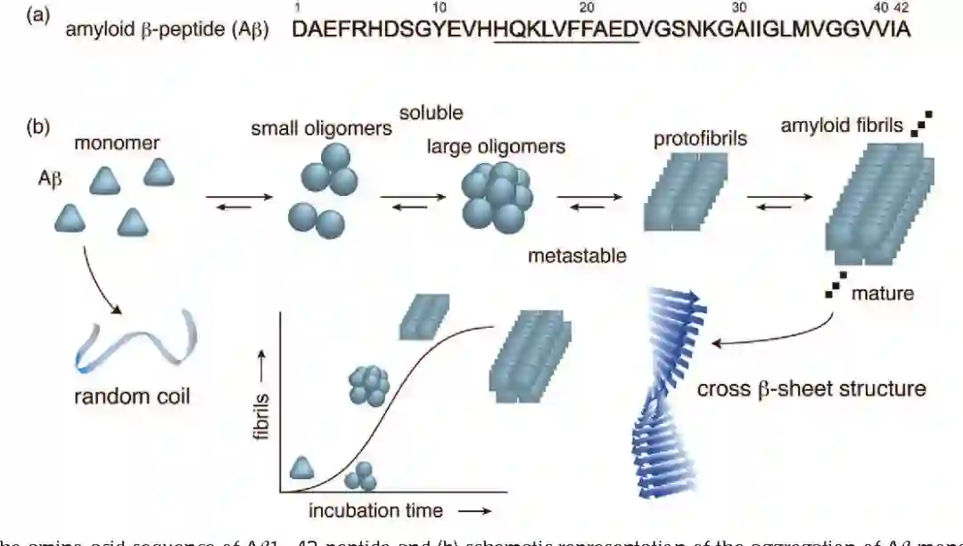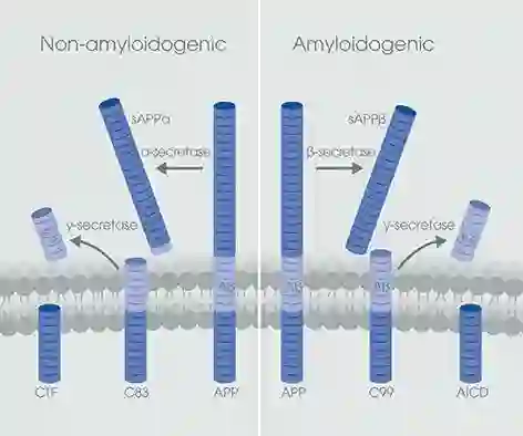 β-淀粉样蛋白(Amyloid β,Aβ)是由β-分泌酶(β-secretase)和γ分泌酶(γ-secretase)切割而形成(Amyloidogenicway)。Aβ可以自发聚集,形成寡聚体,最终形成纤维,形成病理特征之一的Plaques。