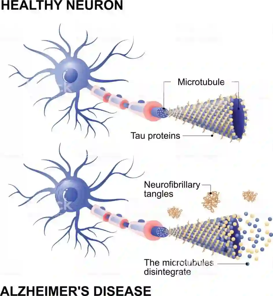 神经元细胞(Neuron)由胞体(Soma)、树突(dendrites)、轴突(Axon)和轴突末梢(Axon terminal)组成。正常的神经元细胞中的微管蛋白是由tau蛋白固定和控制,进行组装和解聚,完成神经信号的传递;而病理状态下的神经元tau蛋白从微管蛋白上解聚下来,发生截短化、磷酸化等病理变化,失去正常功能,导致微管蛋白的解聚,导致神经元细胞的损伤。另一个方面,tau蛋白也具有和Aβ类似的特性,即发生自我聚集,形成寡聚体和纤维,最终形成神经纤维缠绕(Tangles)。