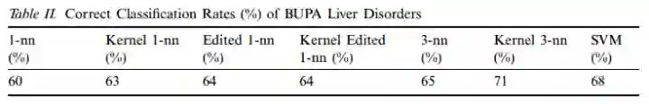 在不同的数据集上,核化 kNN 都能比传统 kNN 表现的更精确和稳定,他们使用 US Postal Service 数据和 BUPA Live Disorder 数据进行了验证,结果表明核化过的 kNN 分类器精度明显好于传统的 kNN,和 SVM 有得一拼: