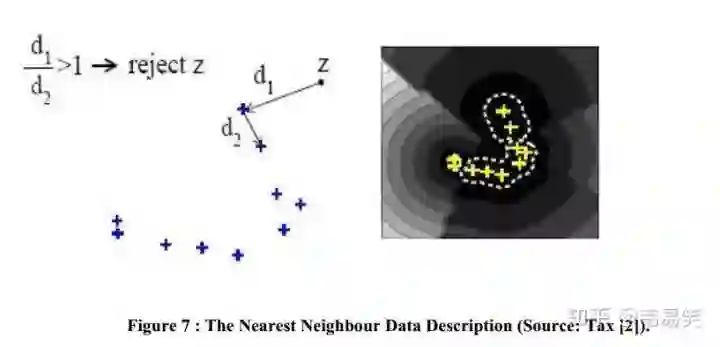 那么接受 z 样本(识别为正类别),否则拒绝它(识别为负类别)。这个方法比较简单,但是如果局部样本太密集的话,d2 非常小,容易识别为负类别被拒绝。所以更成熟的做法是在训练样本中找到 k 个离 B 最近的样本点 C1 - Ck,然后把 d2 设置成 C1 - Ck 到 B 的距离的平均值。这个方法称为 kNN-d,识别效果比之前只选一个 C 的 NN-d 会好很多。