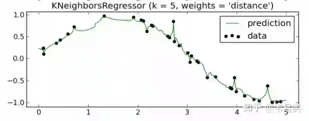 这样误差就小多了,前面不考虑距离 y 值平均的方法在 sklearn 中称为 uniform,后一种用距离做权重的称为 distance。