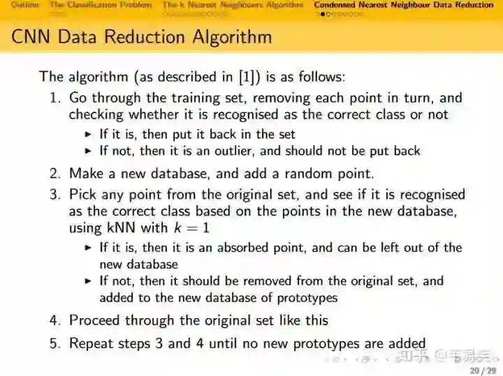 kNN 性能提升还可以通过在尽量不影响分类结果的情况下剔除冗余样本来提升性能,比如经典的 Condensed Nearest Neighbours Data Reduction 算法: