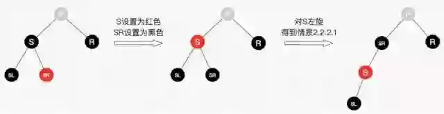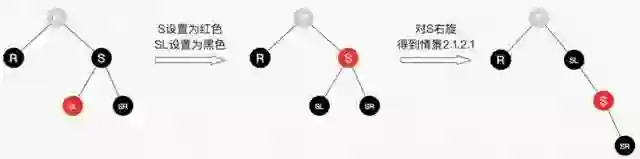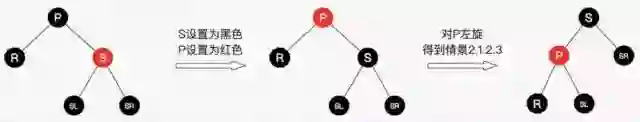兄弟结点所在的子树有红结点,我们总是可以向兄弟子树借个红结点过来,显然该情景可以转换为情景2.1.2.1。图如23所示。