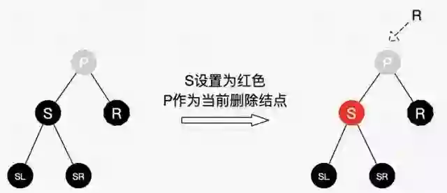 好了,此次兄弟子树都没红结点“借”了,兄弟帮忙不了,找父母呗,这种情景我们把兄弟结点设为红色,再把父结点当作替代结点,自底向上处理,去找父结点的兄弟结点去“借”。但为什么需要把兄弟结点设为红色呢?显然是为了在P所在的子树中保证平衡(R即将删除,少了一个黑色结点,子树也需要少一个),后续的平衡工作交给父辈们考虑了,还是那句,当每棵子树都保持平衡时,最终整棵总是平衡的。
