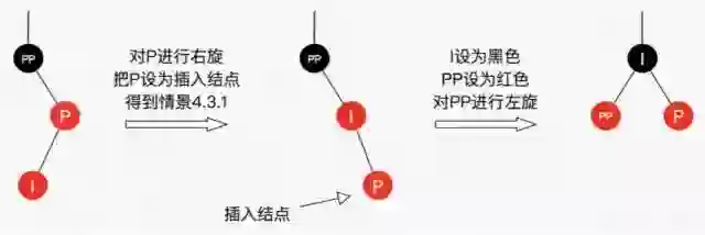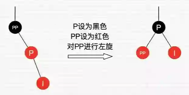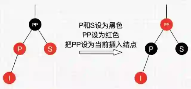 可以看到,我们把PP结点设为红色了,如果PP的父结点是黑色,那么无需再做任何处理;但如果PP的父结点是红色,根据性质4,此时红黑树已不平衡了,所以还需要把PP当作新的插入结点,继续做插入操作自平衡处理,直到平衡为止。