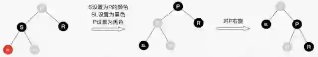 图20的字母并不代表结点Key的大小。R表示替代结点,P表示替代结点的父结点,S表示替代结点的兄弟结点,SL表示兄弟结点的左子结点,SR表示兄弟结点的右子结点。灰色结点表示它可以是红色也可以是黑色。