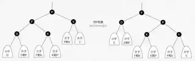 红黑树并不是一个完美平衡二叉查找树,从图1可以看到,根结点P的左子树显然比右子树高,但左子树和右子树的黑结点的层数是相等的,也即任意一个结点到到每个叶子结点的路径都包含数量相同的黑结点(性质5)。所以我们叫红黑树这种平衡为黑色完美平衡。