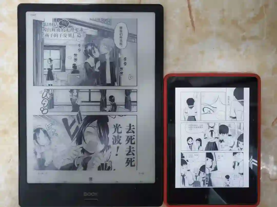 不过,我买文石 BOOX Note 的主要目的之一是看漫画:纸质太贵还不好买、iPad 太重又伤眼、手机和 Kindle 屏幕太小看不清。而 BOOX Note 就完美弥补了以上缺点 —— 我可以从网络下载资源、轻薄无频闪、屏幕比纸质漫画书还要大,再装个 B 漫,就成了全方位漫画利器。