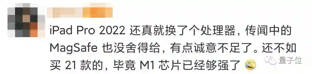 有人就指出:传闻中的MagSafe也没舍得给,有点诚意不足。况且M1的芯片已经够强了,还不如买21款。或许这就是iPad全系涨价的原因?(手动狗头)