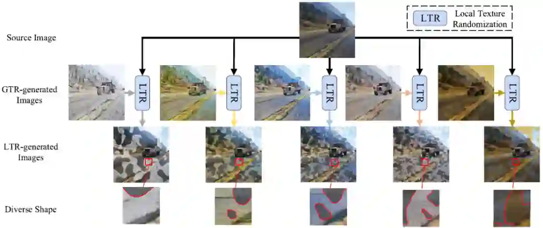 GTR倾向于使网络完全忽略纹理信息,它确实增强了模型对纹理移动的鲁棒性,但也阻止了网络利用一些有价值的纹理线索。事实上,在大多数情况下,图像中只有一些局部区域存在纹理差异。如图3所示,只有红色掩蔽区域的纹理差异较大,其他区域的纹理差异较小。因此,我们提出了局部纹理随机化(LTR)来应对这种情况。由于这些局部区域通常具有任意形状,因此LTR生成具有随机边界的局部纹理随机区域(如图4所示),可以使CNN在各种不同的局部纹理场景下获得良好的性能。