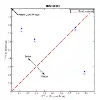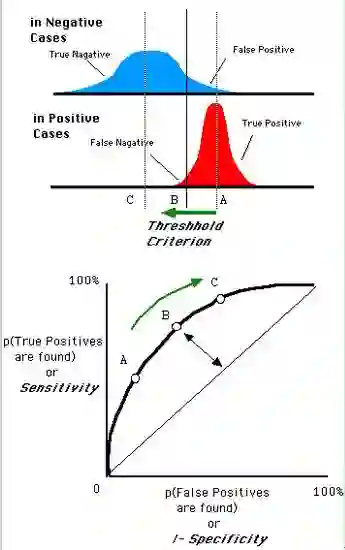 不难发现,这两个指标之间是相互制约的。如果某个医生对于有病的症状比较敏感,稍微的小症状都判断为有病,那么他的第一个指标应该会很高,但是第二个指标也就相应地变高。最极端的情况下,他把所有的样本都看做有病,那么第一个指标达到1,第二个指标也为1。