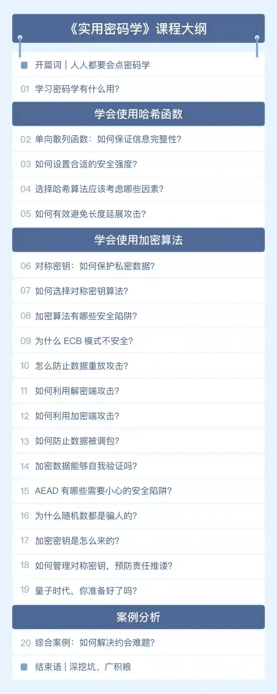 所以,这次我与极客时间合作,出品了《实用密码学》这个专栏,想帮技术人,更快速掌握密码学核心技术。这个专栏是我在密码学应用领域工作 20 余年的结晶,可以教你组合多种密码技术的应用方法,更有 10+ 企业级密码学应用场景分析,给你的技术提供更多的安全保障。