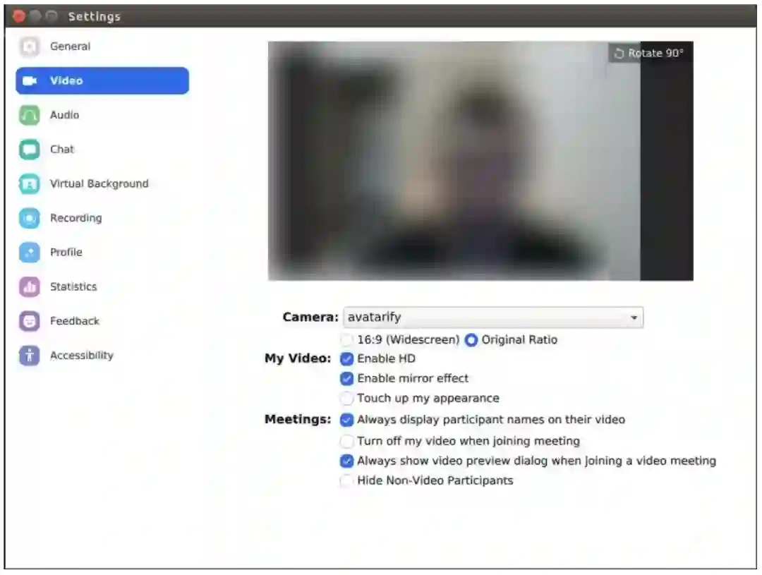 之后打开 Zoom,如下图所示,在设置中的 Video 选项下选择 avatarify,就在视频会议中成功将自己头像换成其他人的了。
