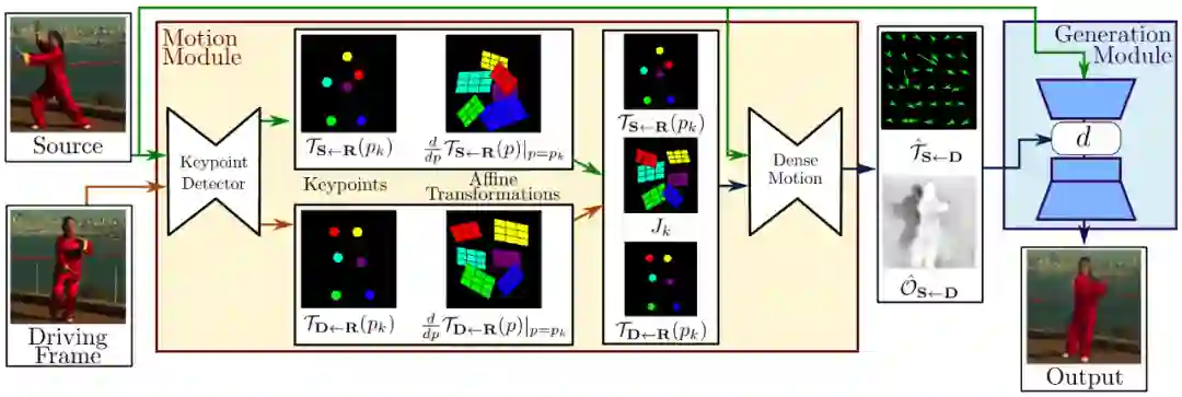上图是「First Order Motion」的方法概述图,该框架由两个主要模块组成:「运动估计模块」和「图像生成模块」。运动估计模块的目的在于预测密集的运动场,此处假设存在一个抽象的参考坐标,并预估存在「从参考到源(from reference to source)」和「从参考到驱动(from reference to driving)」两种转换。因此可以独立处理源帧和驱动帧。做这样的处理是因为模型在测试时会接收从不同视频中采样的源图像帧和驱动帧的组,从视觉上来说可能会很不同。