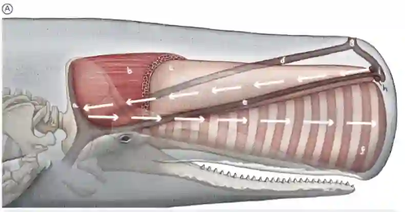 它的生物声学系统如下图所示。在 A 中,抹香鲸头包括鲸蜡器官(c),一个充满近 2000 升蜡状液体的腔体,以及垃圾舱 (f),包含一系列起到声透镜作用的晶圆状体。两者相当于两个连接管,在大型成熟雄鲸中形成一个长约 10 米、孔约 0.8 米的弯曲圆锥形角。在头部前侧的“声唇”(i)发出的声音,通过弯曲的喇叭进行传递,在出口表面产生平坦的波面。而 5-B 中展示的是,抹香鲸回声定位和尾波咔哒声的时间结构。