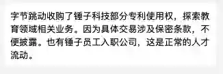 据此,CSDN(ID:CSDNnews)特向字节跳动公司求证,官方回应称,目前字节跳动确实“收购了锤子科技部分专利使用权,探索教育领域相关业务”,此外“也有锤子员工入职公司”,不过这些是“正常的人才流动”,且因为“保密条款”不便透露更多消息。