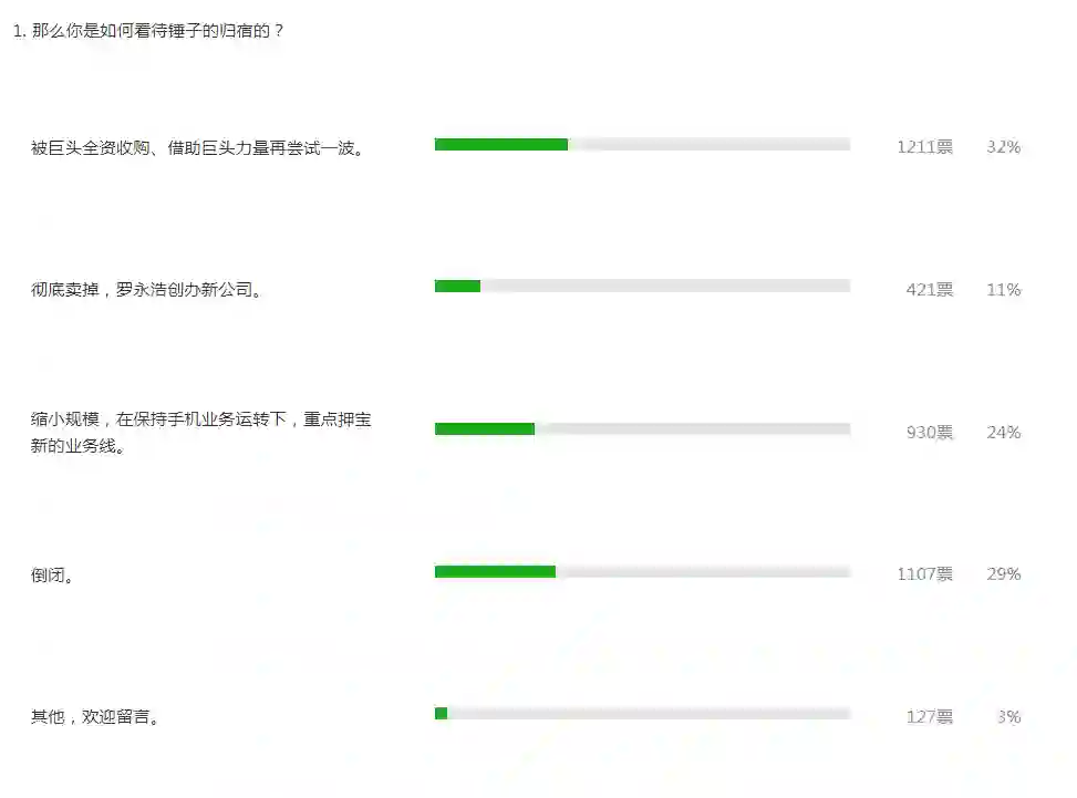 在 CSDN 此前的《锤子变天?》一文中曾发起过关于“你是如何看待锤子的归宿的?”投票,彼时有 32% 的人认为“锤子会被巨头全资收购、借助巨头力量再尝试一波。”锤子也确实不负众望,得到了字节跳动的“援助”,虽然还不知道后续,锤子是否能借此真正“起死回生”。