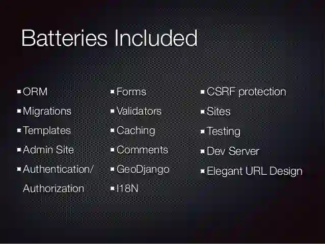 Django基于“自备军需”的理念,您不必使用单独的库来实现常见功能,例如身份验证,URL路由,模板系统,对象关系映射器(ORM)和数据库模型迁移。 如果您正在使用或曾经用过Flask,您一定注意到了它需要调用其他库,如Flask-Login来执行用户身份验证。 Django不是这样。