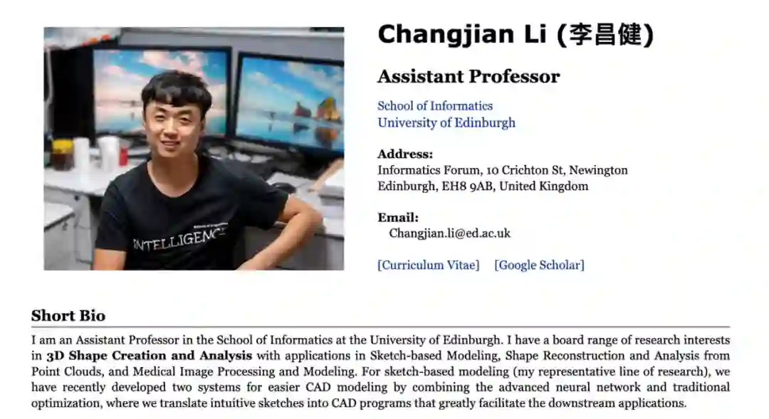 李昌健博士于 2022 年 10 月加入爱丁堡大学信息学院,担任助理教授,他的研究聚焦三维形状生成、创建与分析,包括但不局限于基于草图的自由曲面 / CAD 建模,基于图片或点云的三维重建与分析,医学图像处理与建模等。