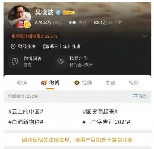 有网友发现,财经大V吴晓波、吴晓波频道的微博被禁言,显示“违反相关法律法规”。此外吴晓波频道的微信公众号已经停更多日。(三言财经)