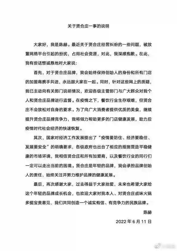 【陈赫回应贤合庄经营纠纷】陈赫11日回应贤合庄经营纠纷称,对于贤合庄品牌,会始终保持创始人的身份和所有门店的加盟商携手共进。同时,针对网上的质疑,已主动向有关部门说明情况,欢迎各级主管部门与广大群众对其个人和贤合庄品牌进行监督。
