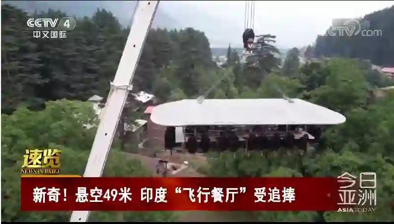 印度马纳利市近日开设了一家“飞行餐厅”。餐厅由起重机吊起,悬挂在距离地面约49米的高空,一次可以容纳24位客人用餐,用餐时间为45分钟,每位客人的费用为3999卢比,约合人民币343元。独特的用餐体验吸引了许多喜欢冒险的客人。(央视网)