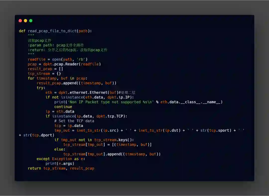 使用Python的Dpkt库(Pip InstallDpkt即可),Dpkt库方便对每一层协议进行拆解,同时也能进行流的拆分以及特征的提取。下面举一个通过无头浏览的方式自动化采集流量(PS:如果需要较大规模的流量采集则可以考虑使用Docker集群的方式)。