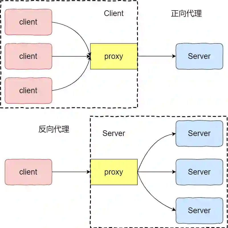 代理作为中间位置,相对请求方为服务端,相当于后端服务端为请求方。代理常见的功能为负载均衡。在负载均衡中需要区分正向代理与反向代理,其中也就会涉及调度算法,比如轮询,一致性哈希等。