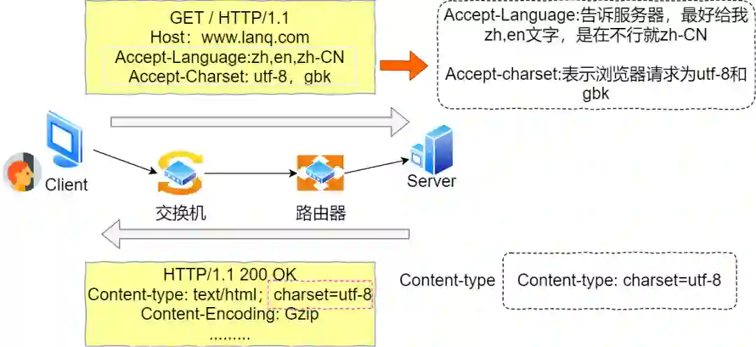 好了,为了各个国家民族顺利友好的沟通和明确的区分。HTTP请求头中使用"type-subtype",注意此时分隔符是"-"。比如EN-GB表示英式英语,ZH-CN表示常用的汉语,那对于客户端而言,它通过Accept-Language来标记自己可以理解的自然语言,对应的服务端使用Content-Language表明实体数据使用的语言类型,如下图所示。