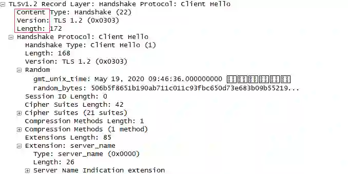 根据Wireshak结果,对TLS进一步剖析。TCP三次握手建立连接,作为礼貌,Client先打招呼"Client Hello"。里面包含了Client的版本号、所支持的密码套件和随机数,如下图所示: