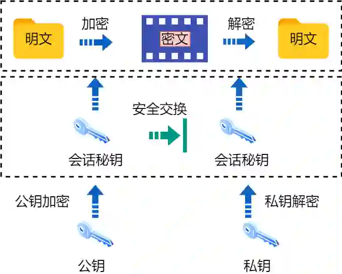 非对称加密算法,大多数是从数学问题演变而来,运算速度较慢。混合加密所谓取长补短。通信过程中使用RSA等解决密钥交换问题,然后使用随机数产生的在对称算法中的会话密钥,最后使用加密。对方使用私钥解密得到的密文取出会话秘钥,这样就实现了密钥交换。