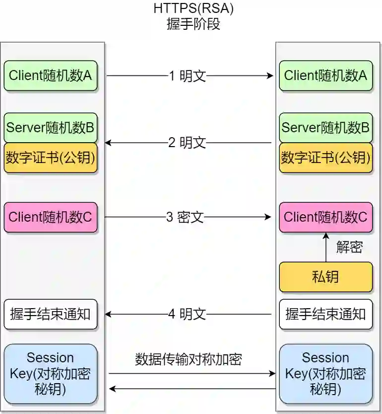 有了主密钥和会话密钥,客户端发送“Change Cipher Spec”和“Finished”消息,最后将所有消息加上摘要发送给服务器验证。
