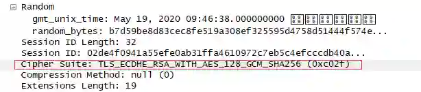 Server端表示尊重,回复"ServerHello",同时进行版本校对,给出随机数(Server Random),从Client算法列表中选择一个密码套件,在这里选择的"TLS_ECDHE_RSA_WITH_AES_128_GCM_SHA256"。