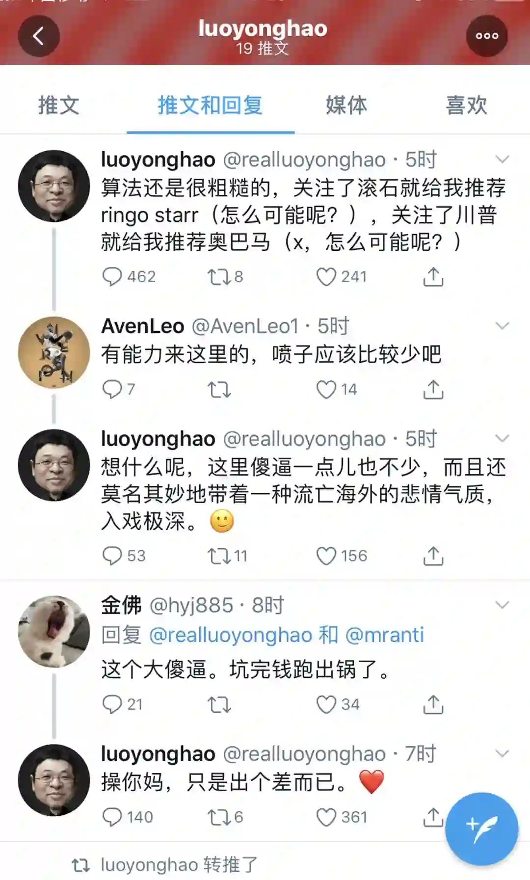 此外,他还对推特的用户体验进行了评论,直言算法很粗糙。“算法还是那么粗糙,关注了滚石就给我推荐ringo starr(怎么可能呢?),关注了川普就给我推荐奥巴马(x,怎么可能呢?)”