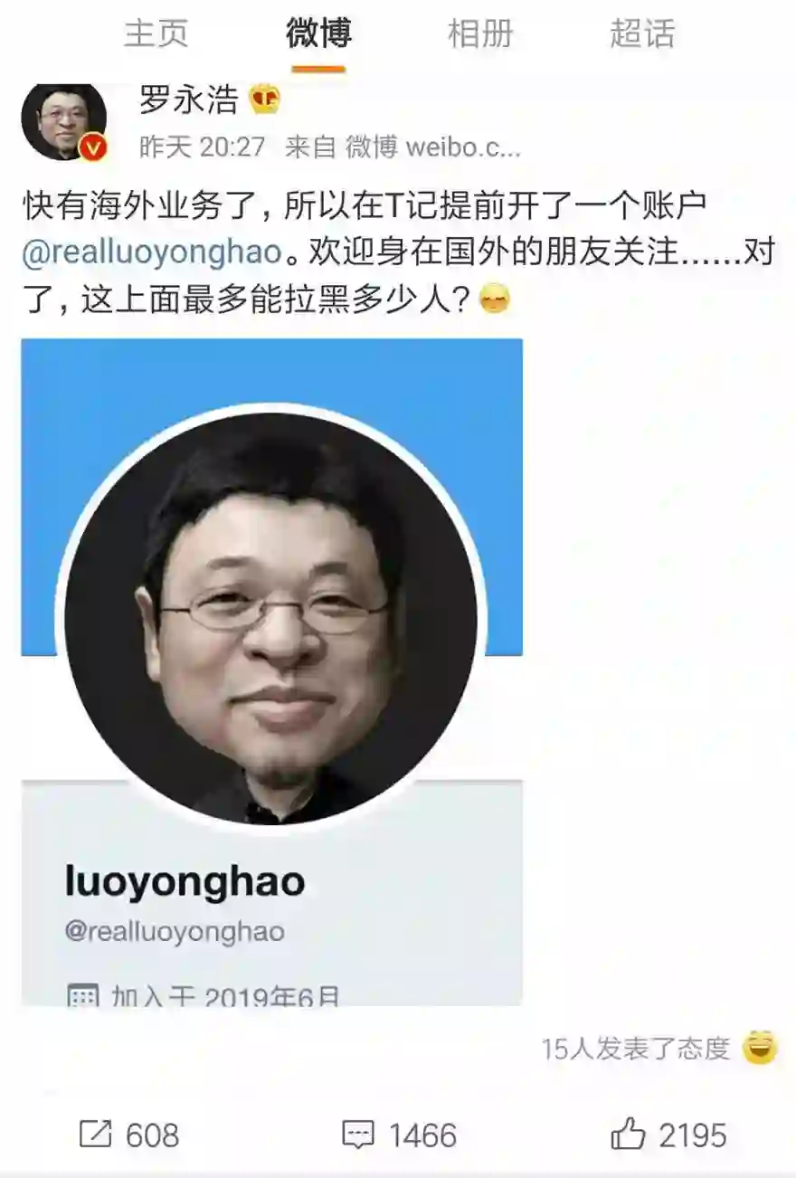 昨日,罗永浩发微博称,为了即将开通的海外业务,他提前开通了一个推特账号,并调侃道:“这上面能拉黑多少人?”