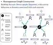第一、我们构建异构图,包括账户类节点,以及多种类型的设备信息,如:电话、MAC、IMSI 以及其他 ID。