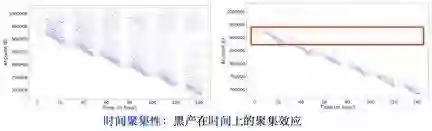2.时间聚集性:见下图所示。两张图分别展示了账户(纵轴)在时间(横轴)上的行为序列。其中一个蓝点代表该用户在某时间点上有登录行为。左图仍然为正常账户,而右图则是黑产账户。因为我们取的都是新注册账户,所以在注册时间点前无行为。从左图可以看出,正常账户在注册之后,每天会有均匀的登录 pattern,右图中的黑产账户则只在某个时间段内集中达成某种行为,这种 pattern 我们称之为时间聚集性。