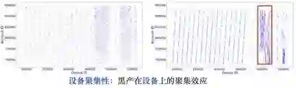 1.设备聚集性:见下图所示。两张图分别展示了用户(纵轴)过去是否在设备(横轴)有过登录行为。蓝色点代表该用户过去有在某设备上登录过。其中,左图显示的是正常账户特征,右图显示的是恶意账户特征。从图中可以看出,左图 pattern 较为均匀(regular),即便不同类型的设备(媒介)上,其和账户连接的 pattern 可能密度不太一样。右图则完全不同,我们可以在黑产账户上看到极为有规律和稠密的 pattern。这说明,黑产账户更倾向于在设备(媒介)的联通上有着高聚集性。